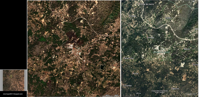 Cada imagem do "antes e depois" do fogo tem 1912x935 pixels (10 metros/pixel). Para ver com todo o detalhe pode ser aconselhável fazer download da imagem.